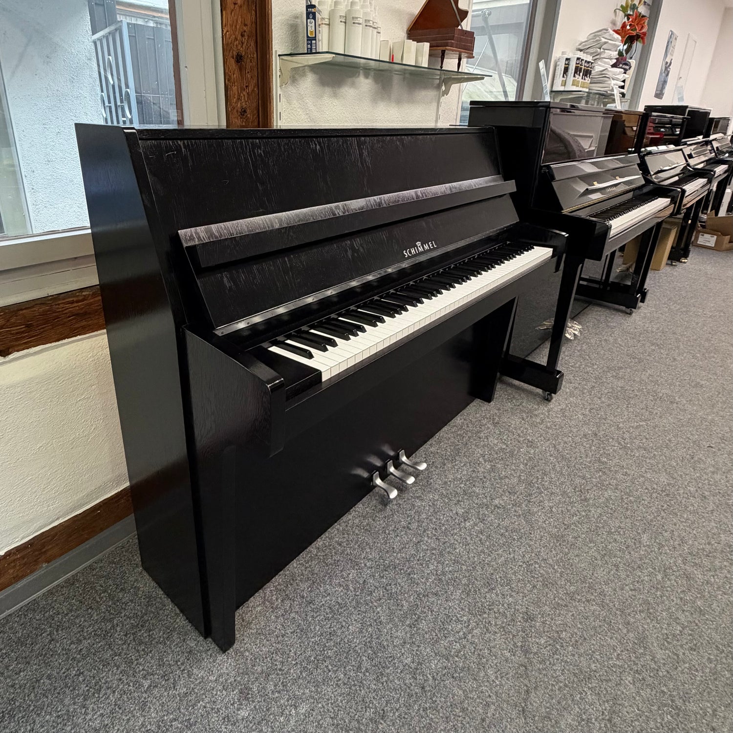 SCHIMMEL Klavier 112/5 E eiche schwarz Occasion Bj. 1989, Silver Edition, sehr guter Zustand Renner Mechanik (gebraucht)